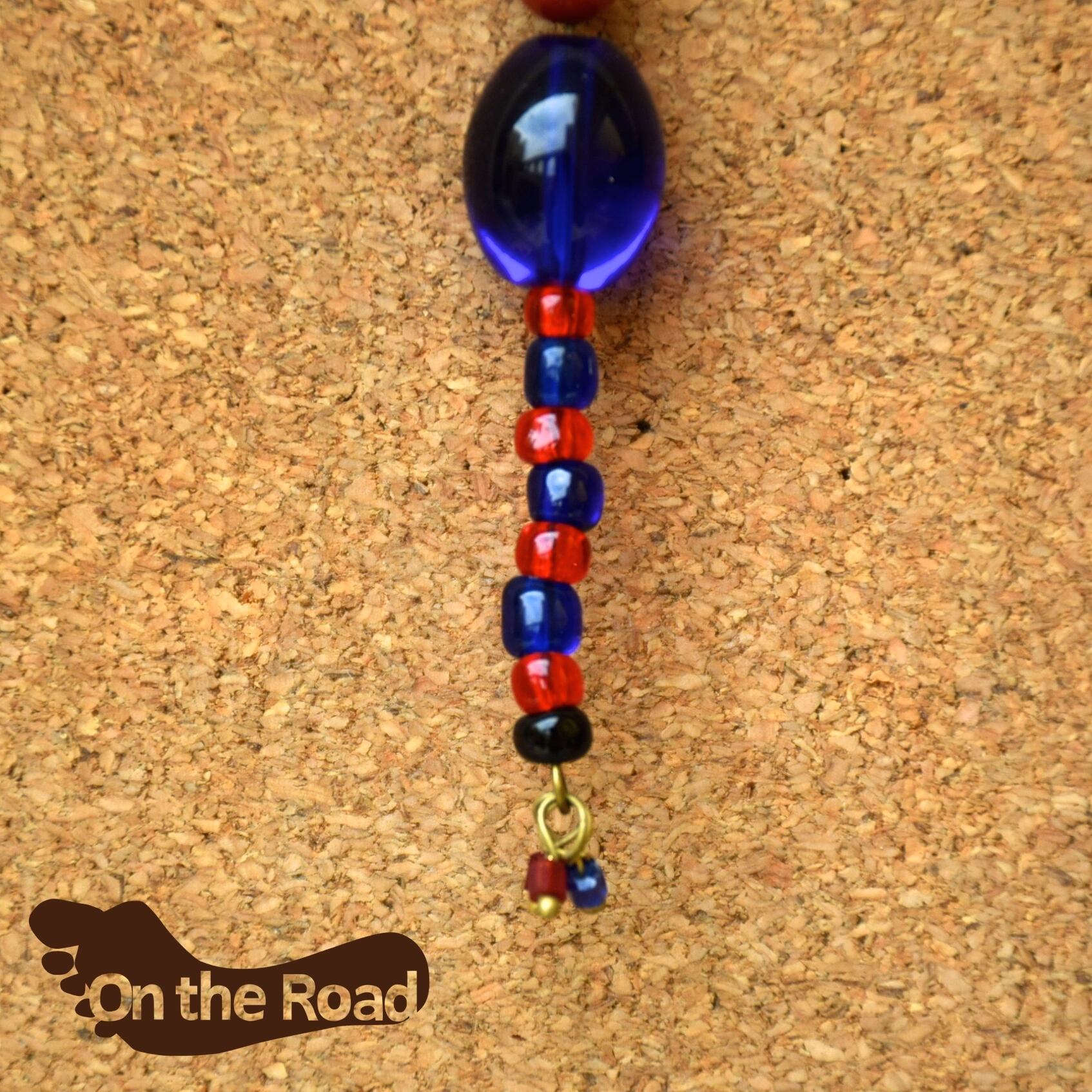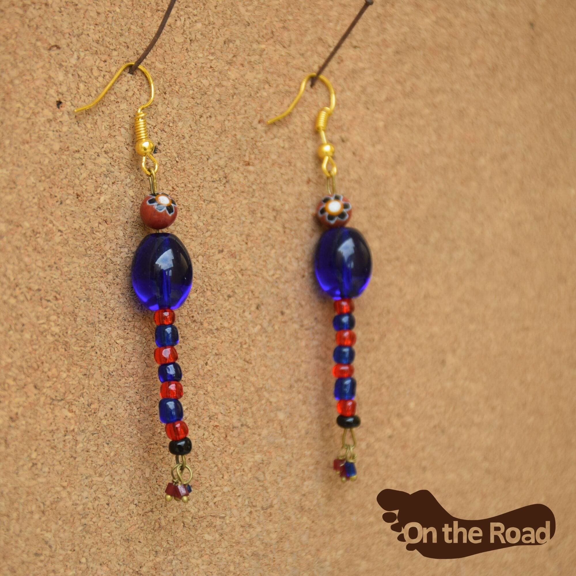 インド産のカラフルなビーズをあしらったピアスです! 子どもたちが、それぞれの好みで石やビーズを選び作りました。 小さなビーズを通す所や、最後の始末に苦戦しながらも、 その分一つ一つ時間をかけ、一生懸命作り上げた個性あふれる作品です。 【全体の長さ(金具部分含む】75mm 【色】(ガラスビーズ)ブルー(小ビーズ)レッド・ブルー・花柄 【金具】チタン(ゴールド) P-010
